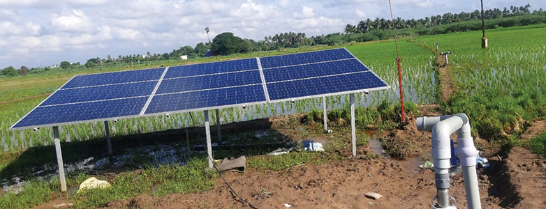 A solar pumpset is a device that uses solar energy to pump water for irrigation, domestic use, or other purposes. It consists of a solar panel, a pump, a controller, and sometimes a battery or an inverter.